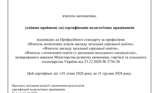 Вчитель математики Юлія Григорівна Даниленко успішно пройшла сертифікацію!