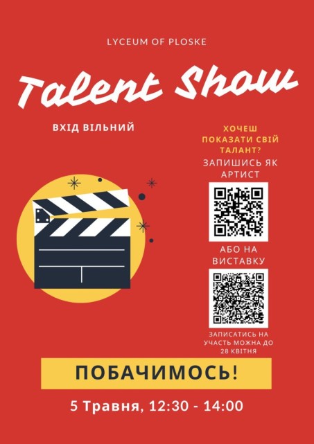 Всім привіт! У нашому ліцеї відбудеться "Шоу талантів" — 5 травня з 12:30 до 14:00. На цьому заході ми побачимо виступи юних талантів з 1-го по 11 клас!
